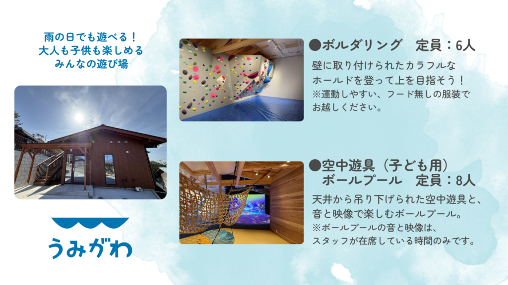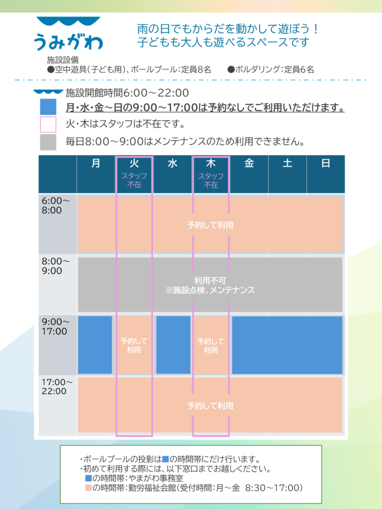 ・うみがわ施設について、スタッフが不在の日・時間は、必ず保護者または18歳以上の方が付き添ってご利用ください。また、ご予約は施設で遊ぶ方のみ必要になります。見守りだけの方は、予約不要です。