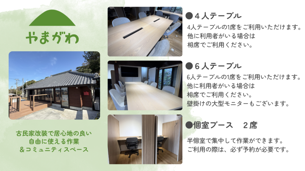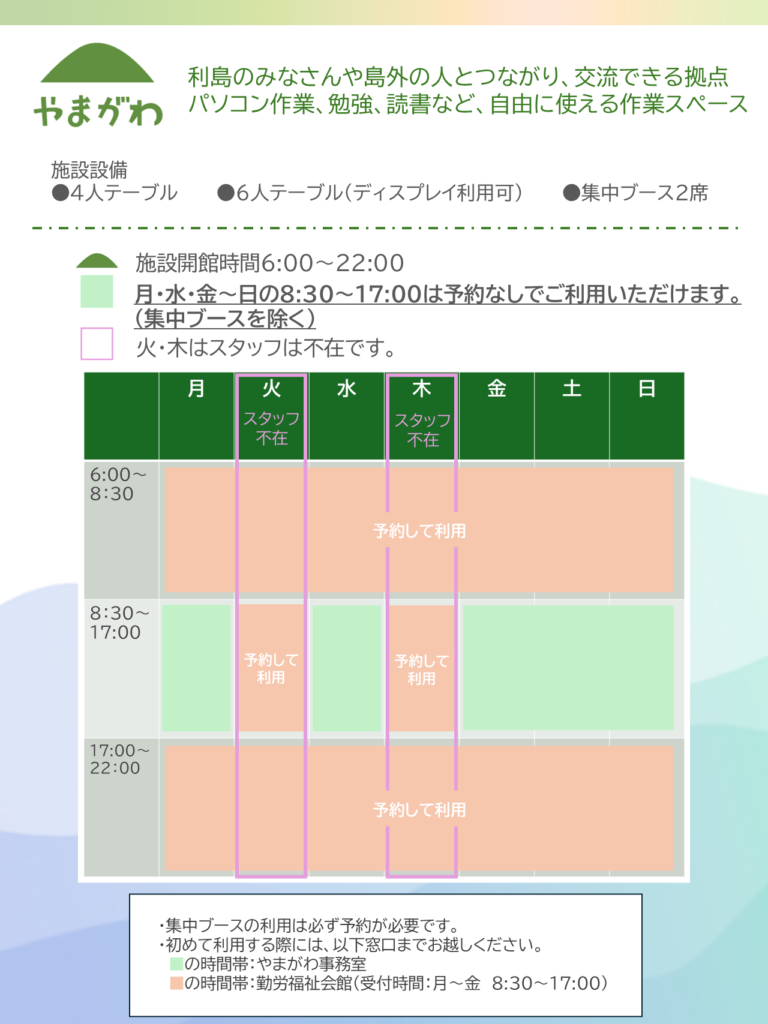 ※やまがわ集中ブースのご利用は、スタッフ在席に関わらず、必ず予約が必要です。